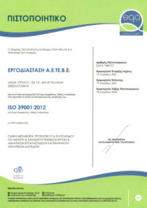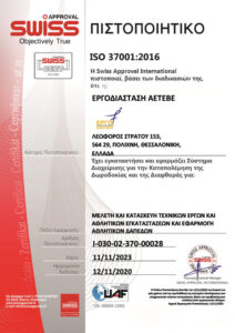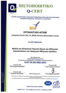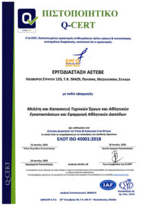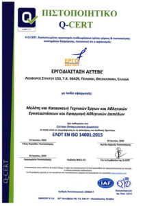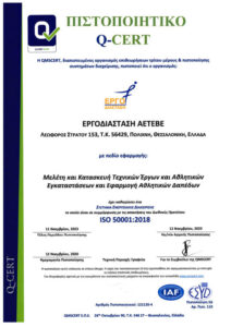 H εταιρία διαθέτει με πεδίο εφαρμογής στη Μελέτη κα Κατασκευή Τεχνικών Έργων και Αθλητικών Εγκαταστάσεων και Εφαρμογή Αθλητικών Δαπέδων Σύστημα Διαχείρησης ποιότητας ISO 9001:2015 , Σύστημα Περιβαλλοντικής Διαχείρισης ISO 14001:2015, Σύστημα Διαχείρισης Υγείας και Ασφάλειας στην Εργασία ISO 45001:2018, Σύστημα Διαχείρησης για την Καταπολέμηση της Δωροδοκίας και της Διαφθοράς ISO 37001:2016 & Σύστημα Ενεργειακής Διαχείρησης ISO 50001:2018